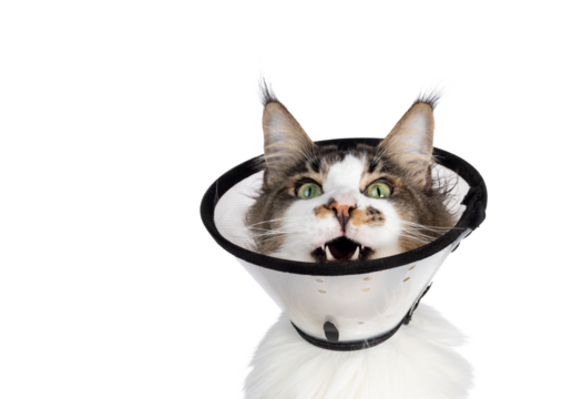 Head shot of young adult Maine Coon cat, wearing protective medical cone around neck. Looking annoyed up with mouth open to protest. Isolated cutout on a transparent background.