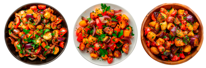 Fresh catalan roasted vegetable salad in a plate isolated on a white or transparent background. Close-up of salad with potato, paprika and basil in wooden, black and white plate, top view