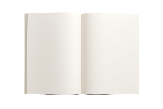 Open blank book mockup with clean white pages for magazine or catalog design isolated on transparent background