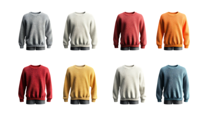 Eight different colored crewneck sweatshirts are neatly arranged in two rows isolated on a transparent background suitable for apparel catalog