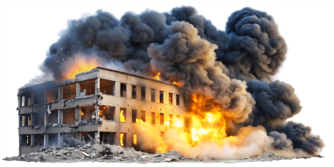 Collapsed building engulfed in fire and smoke isolated on a transparent background