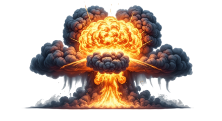 Massive nuclear explosion with fiery mushroom cloud and thick dark smoke, symbolizing war, destruction, and catastrophic disaster, isolated on white background