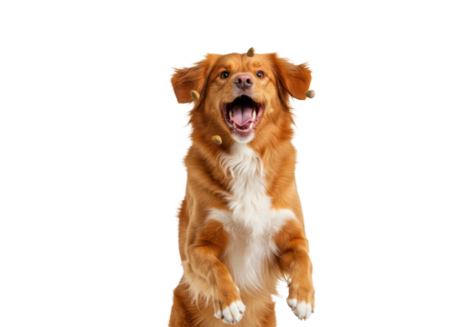 A 2-3 year old Nova Scotia Duck Tolling Retriever, reddish-brown, white markings, leaping mid-air, mouth open, catching brown kibble against a brilliantly lit transparent studio background with copy