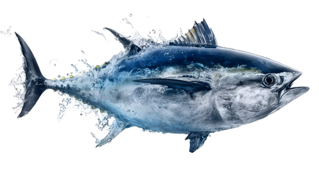 Bluefin Tuna isolated in white, with a water splash effect. World Tuna Fisheries.