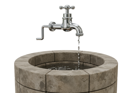 Isolated stone garden well with dripping faucet filling it with water, on display