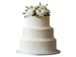 Elegant three-tier wedding cake with roses and greenery, cut out