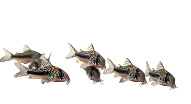 Group of adorable corydoras catfish swimming together in a freshwater aquarium tank