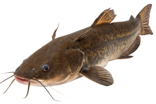 A detailed image of a catfish with a smooth, brown body and long whiskers. The fish is positioned against a transparent background, showcasing its features clearly.