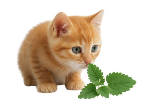 Kitten sniffs catnip in playful exploration. isolated on a white background.