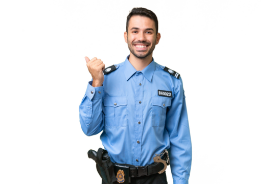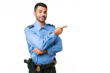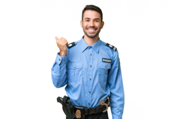 Young police caucasian man over isolated background pointing finger to the side