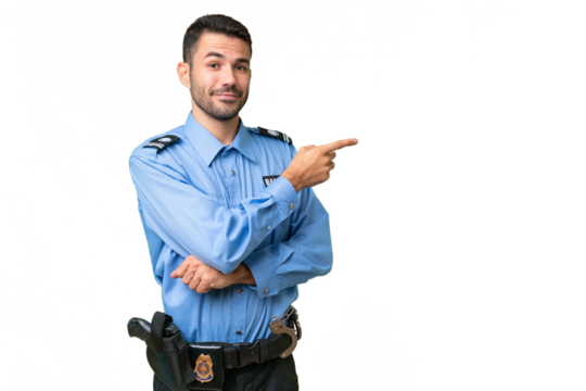 Young police caucasian man over isolated background pointing to the side to present a product