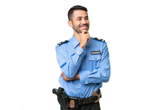 Young police caucasian man over isolated background looking to the side and smiling