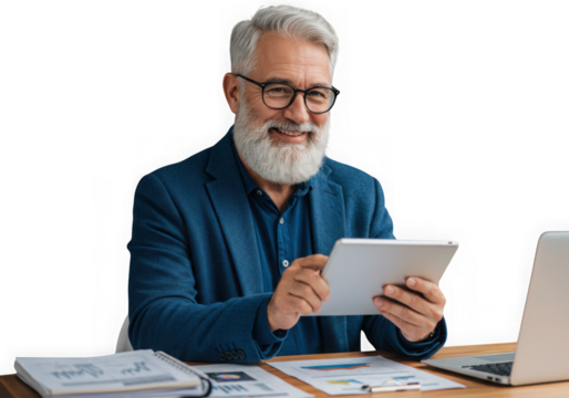 Smiling professional man wearing glasses uses tablet for business and technology tasks transparent background