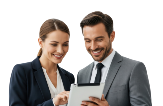 Smiling business professionals a man and a woman looking at a tablet computer together isolated on transparent background