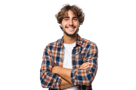 A serious young man with messy brown hair is looking straight ahead isolated on transparent background