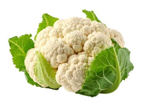 A fresh cauliflower isolated on transparent background, showcasing its pristine white florets and vibrant green leaves, a healthy and versatile vegetable option