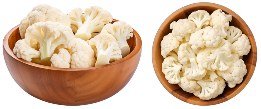 White cauliflower cut in pieces in a wooden bowl, side and top view, isolated on transparent background, vegetable bundle