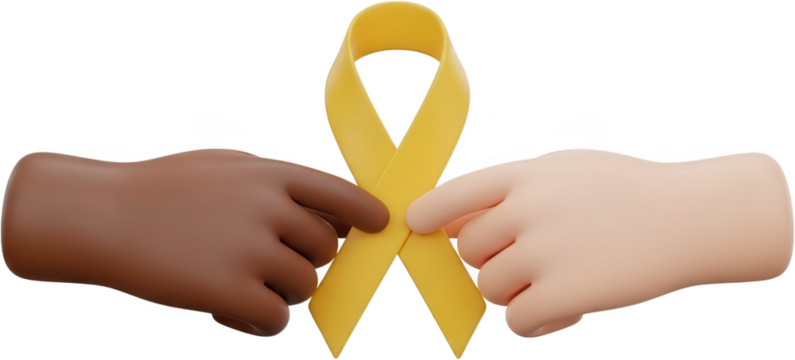 Two diverse 3D rendered hands with different skin tones gently hold the center of a bright yellow awareness ribbon loop yellow ribbon unity diversity support multiracial transparent background