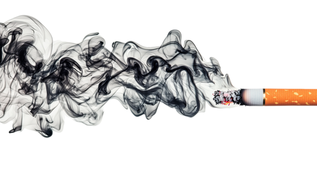 Png of Cigarette with smoke swirling in artistic patterns, showcasing the effects of smoking and its health implications.