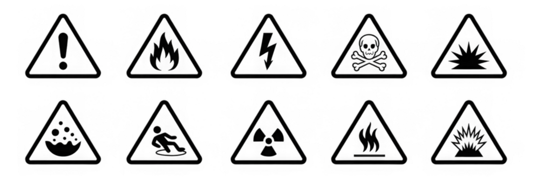 Hazard and warning signs with various danger symbols including toxic, flammable, electrical, biohazard, explosion, slipping and chemical risks shown inside triangular caution shapes – stock