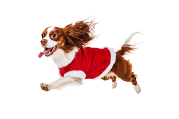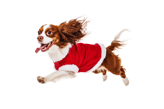 Full body shot of Cavalier King Charles Spaniel dog, running happily, smiling. Wearing Christmas costume.