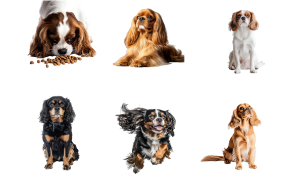 Set of cavalier king charles spaniel standing pose isolated on transparent background