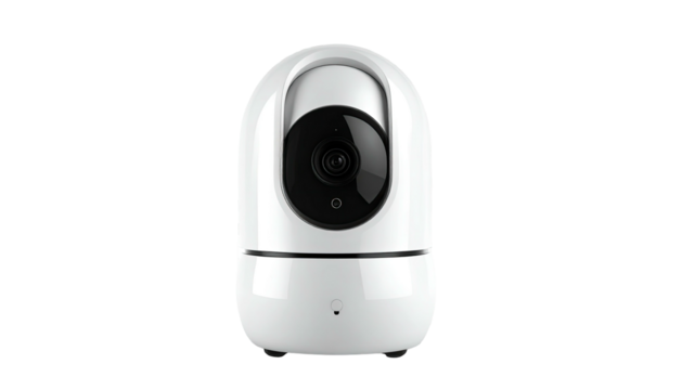 Modern wireless security camera with rotating head and LED lights on a transparent background