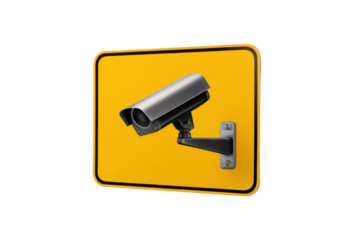 Security camera mounted on a yellow warning sign against black background surveillance cctv