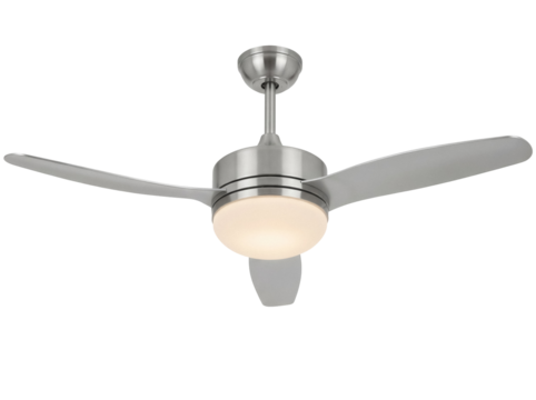 Brushed nickel ceiling fan with light isolated PNG, modern indoor lighting fixture for home decor and ventilation on transparent background