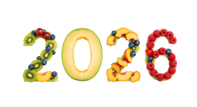 Fresh colorful 2026 numbers made with kiwi, melon, blueberries, peaches, and raspberries, healthy fruit digits perfect for New Year celebrations
