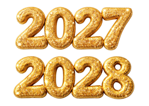 Golden glitter numbers 2027 and 2028 celebration isolated on transparent background, generative ai