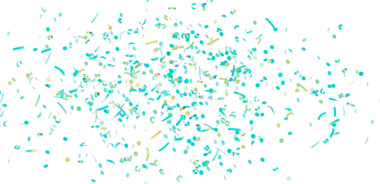 Light blue confetti scattered on a white background, creating a festive and celebratory feel.