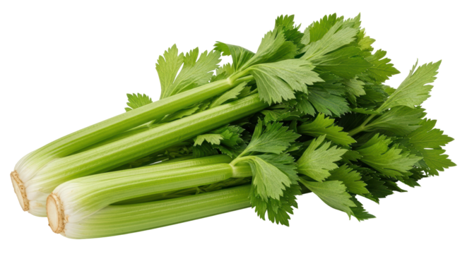 Green celery and celery root with leaves. Garden celery set. PNG isolated with transparent background. Flat lay, top view. Without shadow.