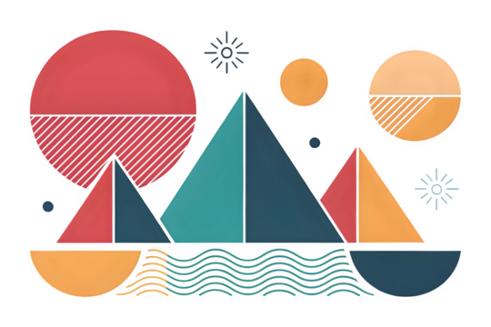 Abstract geometric landscape with stylized mountains and celestial bodies on transparent background
