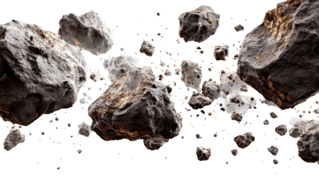 Asteroids and meteoroids drifting through space, forming a celestial debris field with a transparent background