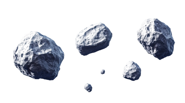 Flying Asteroids in Space with Detailed Texture Against Transparent Background