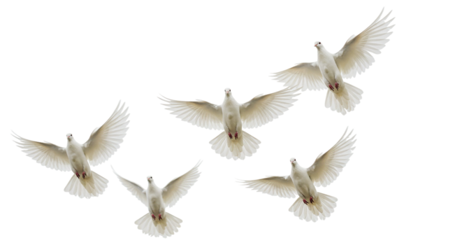 A serene flock of white doves soaring in unison emblems of peace and hope against a vast night on transparent background