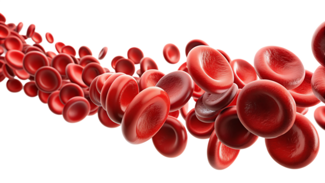 Red blood cells flowing like ripe cherries, isolated on white background