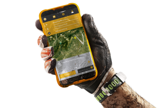 Sport, tourism. Smartphone GPS navigator in hand, on transparent background.