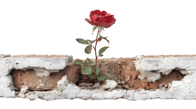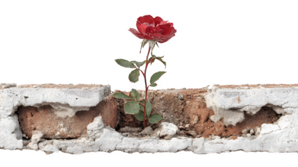 A single red rose growing out of a cracked cell wall brick, metaphor for survival, isolated on Transparent Background