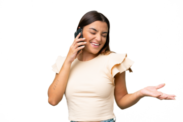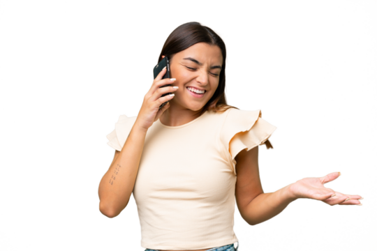 Young caucasian woman isolated on green chroma background keeping a conversation with the mobile phone with someone