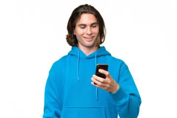 Young caucasian man isolated on green chroma background sending a message with the mobile