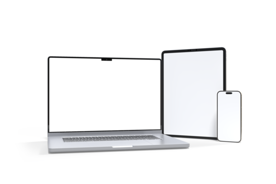 3D Realistic laptop, tablet and smartphone digital device mockup with blank screen isolated on background. Mockup technology empty display template for ui, ux, app, ads and website presentation
