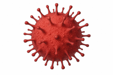 A 3D rendering shows a green coronavirus particle, likely COVID-19, surrounded by numerous red blood cells, illustrating viral interaction within the bloodstream. background removed