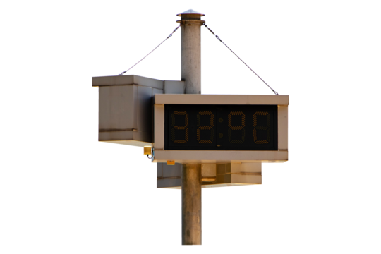 Digital Signs symbol LED electric Thermometer marking show red number 33 degrees celsius isolated on cutout PNG or transparent background. Air temperature.