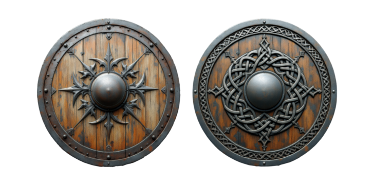 Intricately Designed Wooden Viking Shields with Metal Embellishments, Perfect for Historical Reenactments and Decor, Isolated on Transparent and White Background
