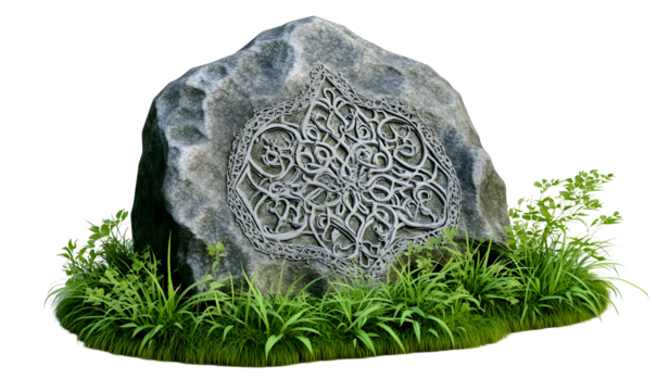 Carved stone, nature, intricate design, grass, background, garden, decoration, 3D render, website
