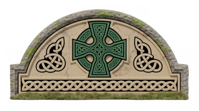 Celtic cross on a stone monument with grass green beige isolated on a transparent background