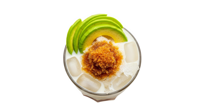 Overhead view of an Avocado Es Cendol drink featuring ice, milk, and sliced fruit garnish.