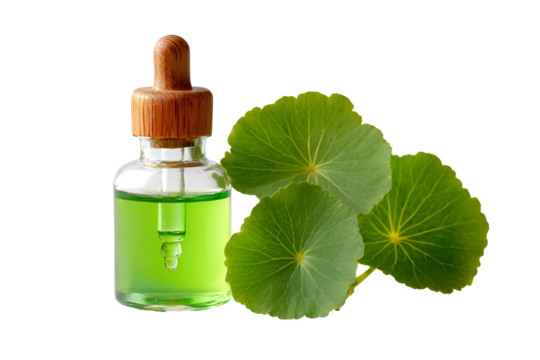Green liquid in dropper bottle with gotu kola leaves isolated on transparent background
